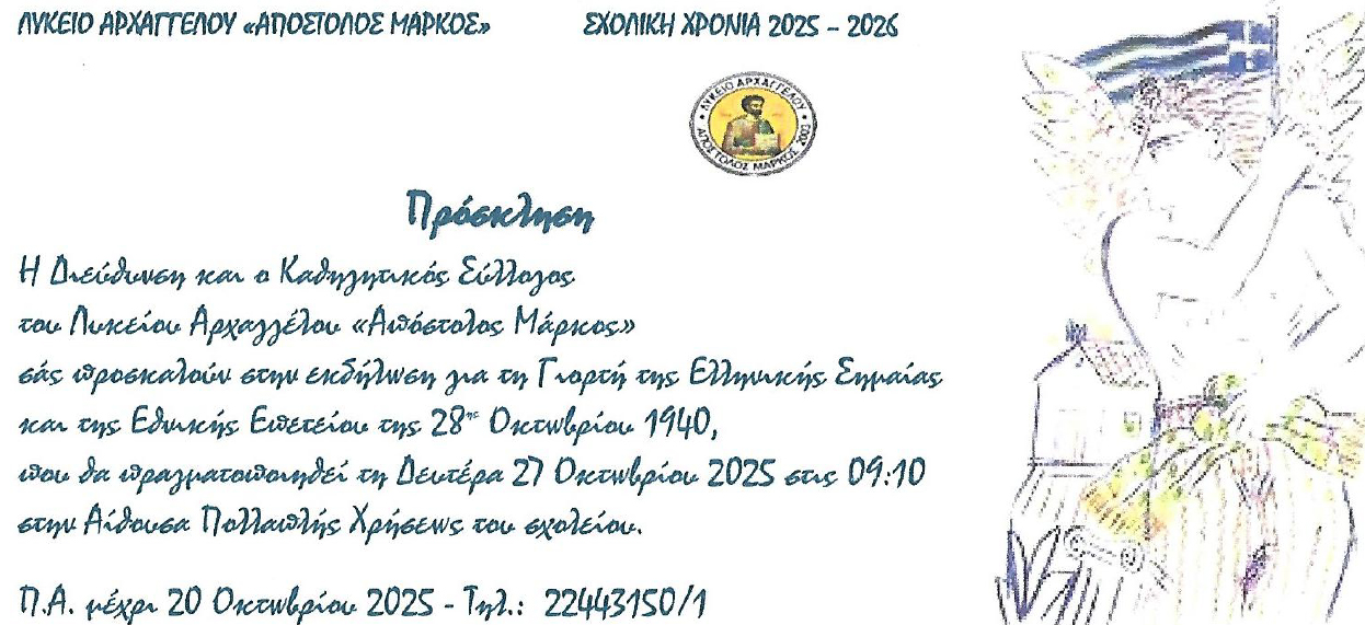 Σας καλοσωρίζουμε στην ιστοσελίδα του Λυκείου Αρχαγγέλου «Απόστολος Μάρκος», στην οποία θα έχετε την ευκαιρία να ενημερώνεστε με ανακοινώσεις σε εκπαιδευτικά θέματα, προγράμματα, δραστηριότητες και εκδηλώσεις της σχολικής ζωής