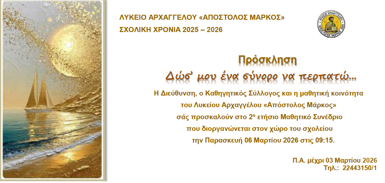Καλώς ήλθατε στην ιστοσελίδα του Λυκείου Αποστόλου Μάρκου . Φιλοδοξία μας είναι, η ιστοσελίδα να αποτελέσει έναν δίαυλο άμεσης διαδικτυακής επικοινωνίας και συνάμα έγκαιρης και έγκυρης ενημέρωσης των εκπαιδευτικών, των μαθητών αλλά και των γονέων.Η τακτική ενημέρωση και επικοινωνία θα συμβάλει στην υλοποίηση του οράματος για ένα καλύτερο αύριο. Αυτή ακριβώς είναι και η μέγιστη προσπάθεια της διεύθυνσης, του διδακτικού προσωπικού, αλλά και όλης της σχολικής κοινότητας του Λυκείου Αποστόλου Μάρκου.