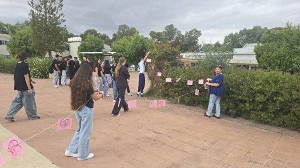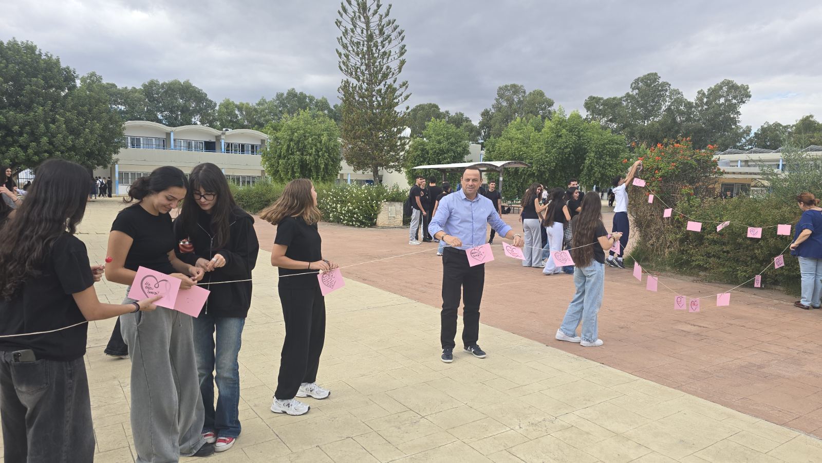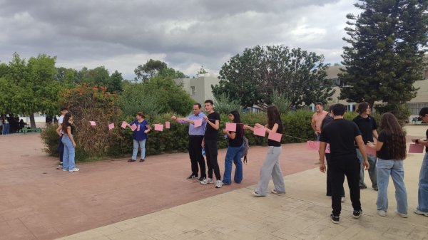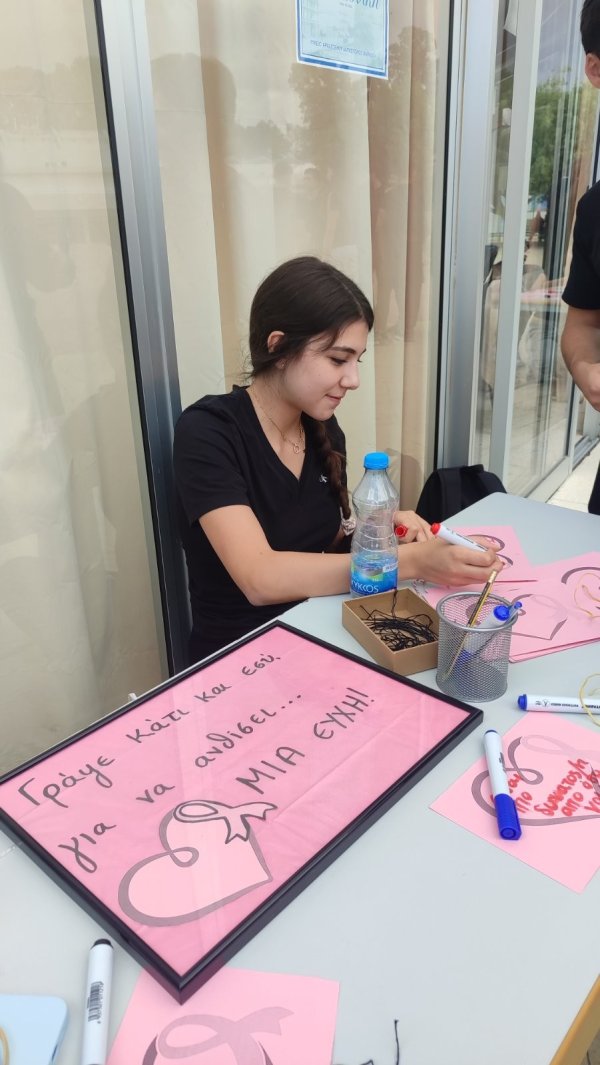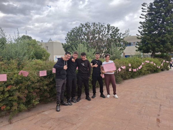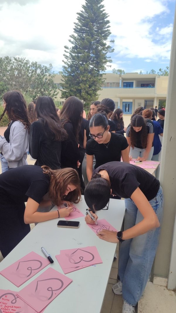 Στο πλαίσιο των δράσεων ενημέρωσης και πρόληψης για τον καρκίνο του μαστού, πραγματοποιήθηκε στο σχολείο μας μια όμορφη και συμβολική δραστηριότητα με τη συμμετοχή μαθητών, μαθητριών, εκπαιδευτικών και του Διευθυντή. Οι συμμετέχοντες έγραψαν πάνω σε πολύχρωμα χαρτάκια ευχές, σκέψεις και μηνύματα αισιοδοξίας, τα οποία ενώθηκαν πάνω σε σχοινί, σχηματίζοντας ένα πολύχρωμο μονοπάτι ελπίδας που κάλυψε μεγάλο μέρος της αυλής του σχολείου. Η δράση, με τίτλο «Γράψε κάτι κι εσύ… για να ανθίσει μια ευχή!», στόχευε να υπενθυμίσει σε όλους τη σημασία της πρόληψης, της ενημέρωσης και της αλληλεγγύης απέναντι σε όσους δίνουν τη δική τους μάχη με τον καρκίνο του μαστού.