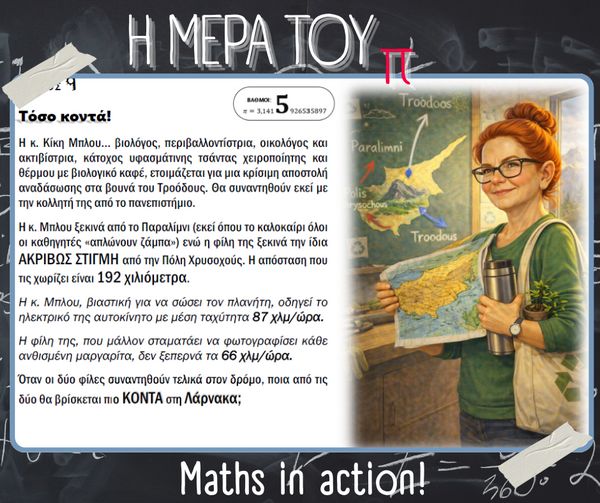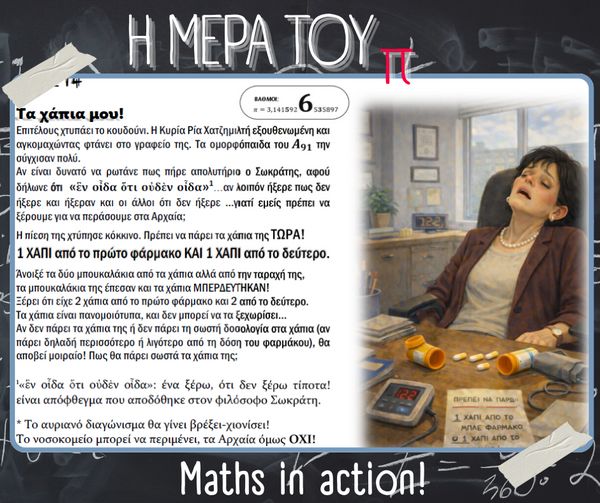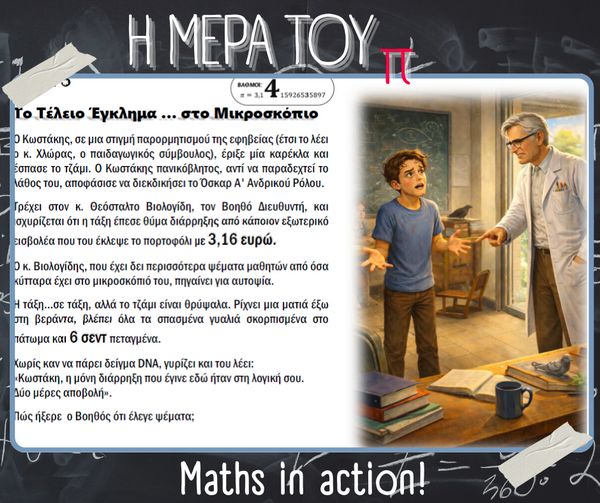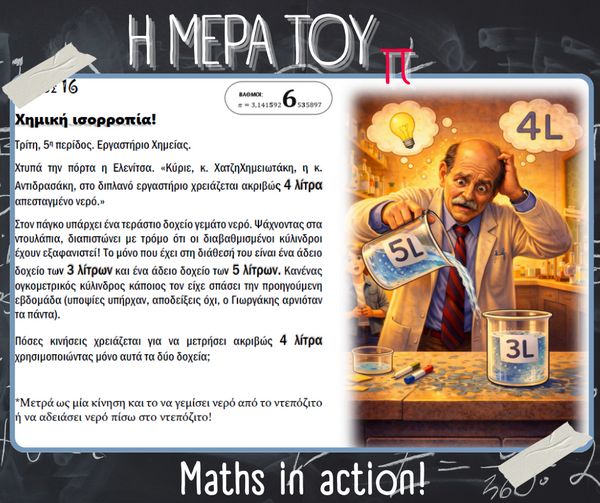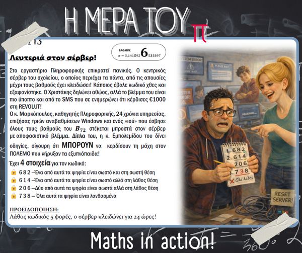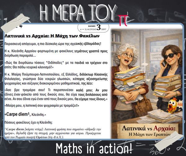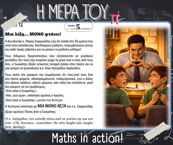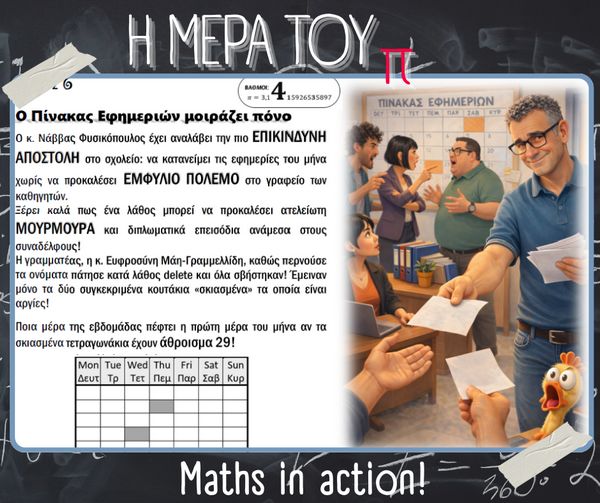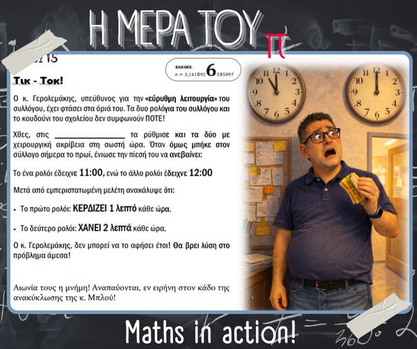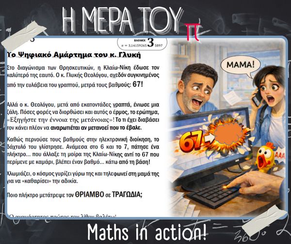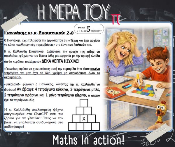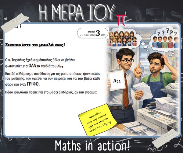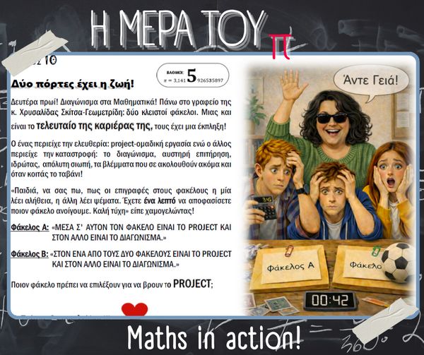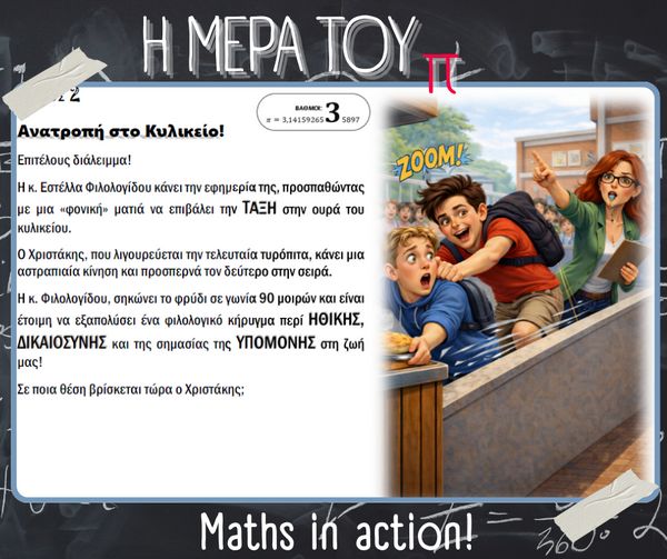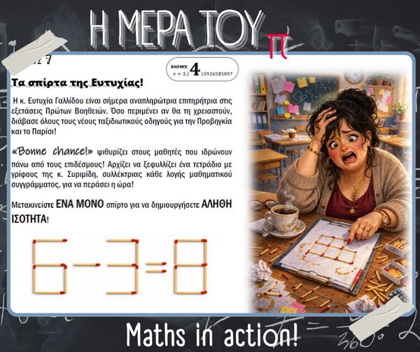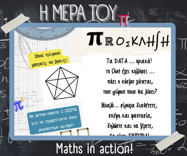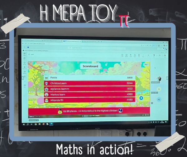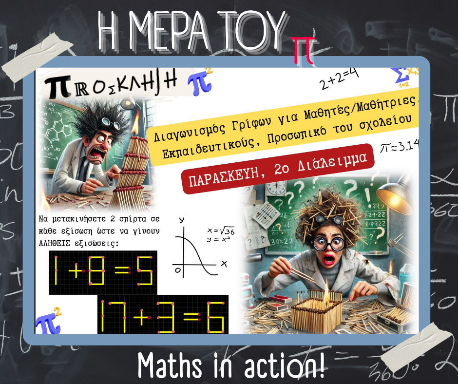 Με αφορμή την Παγκόσμια Ημέρα Μαθηματικών (14 Μαρτίου) και τον εορτασμό της σταθεράς π (π = 3.14), στο σχολείο μας πραγματοποιήθηκαν την Παρασκευή 13 Μαρτίου διάφορες δημιουργικές και διαδραστικές δράσεις με τη συμμετοχή μαθητών, μαθητριών και εκπαιδευτικών.
