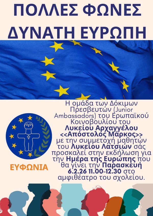 Σε μια όμορφη εκδήλωση που πραγματοποιήθηκε στο αμφιθέατρο του σχολείου μας την Παρασκευή, 6 Φεβρουαρίου 2026, οι Δόκιμοι Πρεσβευτές τίμησαν τη Μέρα της Ευρώπης .