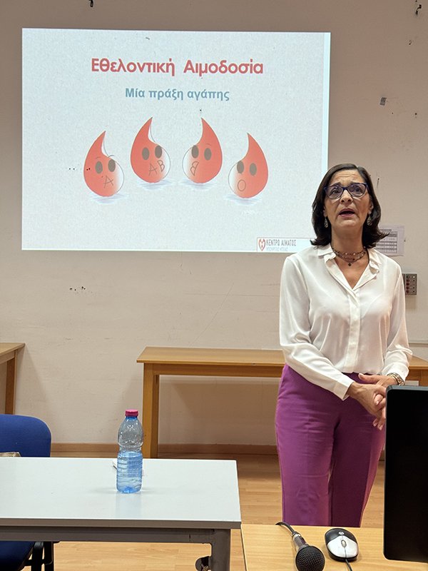 Η κυρία Στέλλα Πέτρου, με την πολυετή εμπειρία και γνώση της στο θέμα, ενημέρωσε τους μαθητές και τις μαθήτριες για τη σημασία της προσφοράς αίματος, τη διαδικασία της αιμοδοσίας και τον ανεκτίμητο ρόλο που μπορεί να έχει κάθε εθελοντής αιμοδότης στη διάσωση ανθρώπινων ζωών.